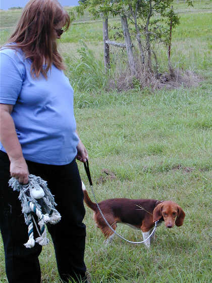 Linda, rag monkey, and Rusty tour the backyard.