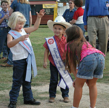 Colorado County Fair Thursday was the start of the 24th Annual Colorado County Fair. In the weeks leading up to the fair there's competition for Fair Queen. There's also junior competition and here's a photograph of Most Beautiful Little Miss and Little Mister telling stories before the opening ceremony. (09.12.02) |