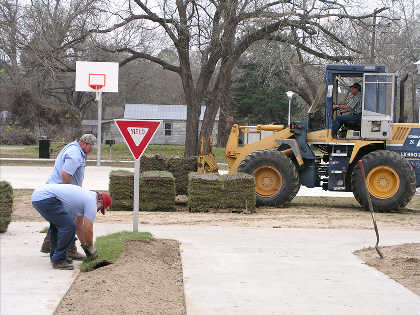 A city crew starts laying grass on the prepared surface.
