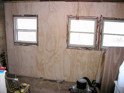 Rain Creek Farm A bookshelf counter will be installed under the single window at the left. Our Chambers stove will just fit between the windows with a vent hood and wall cabinet above. A vintage cast iron and white porcelain sink with drain boards will be centered under the double windows. (12.29.02) [Olympus C-5050] |