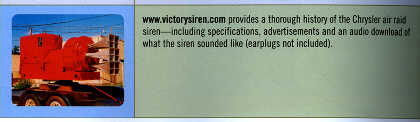 Forward Magazine A reference section in the back of Forward magazine sites VictorySiren.com. It reads, "www.victorysiren .com provides a thorough history of the Chrysler air raid siren - including specifications, advertisements and an audio download of what the siren sounded like (earplugs not included)." (08.01.03) [CanoScan 5000F] |