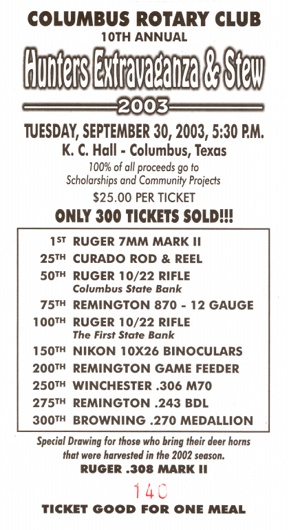 Hunters Extravaganza Here is David's losing ticket. He tries to think think of it as a $25 bowl of stew. David would have liked winning the 7mm Ruger Mark II, .306 Winchester M70 or .270 Browning Medallion. Oh well, maybe next year. (09.30.03) [CanoScan 5000F] |