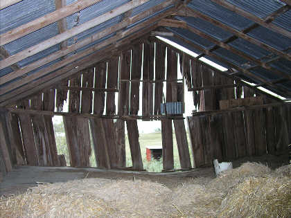 A flash photograph reveals the separations and sagging floor beyond very old hay bales.