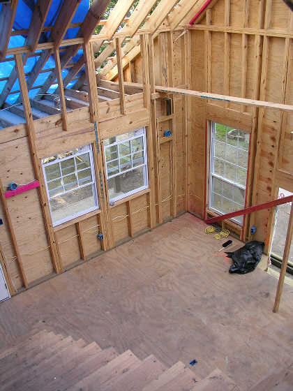 The view of the living room from the head of the stairs.