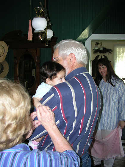 Linda watches as Astrid Elise peeks over Hal's shoulder and checks out the farmhouse.