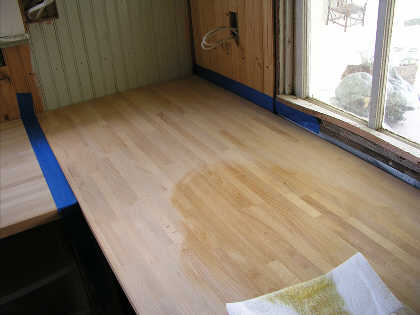 After sanding a preparation this section of butcher-block countertop starts to get oiled.