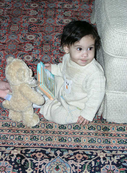 Astrid sits on the floor to 'read' a book that her great grandmother gave her.