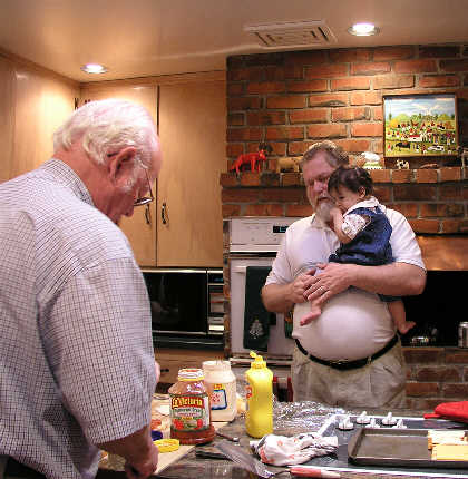 David and Astrid watch Jerry build a sandwich.