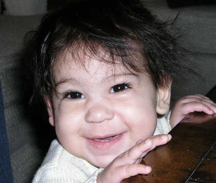 Astrid shows off standing up at the coffee table. See her two bottom teeth?